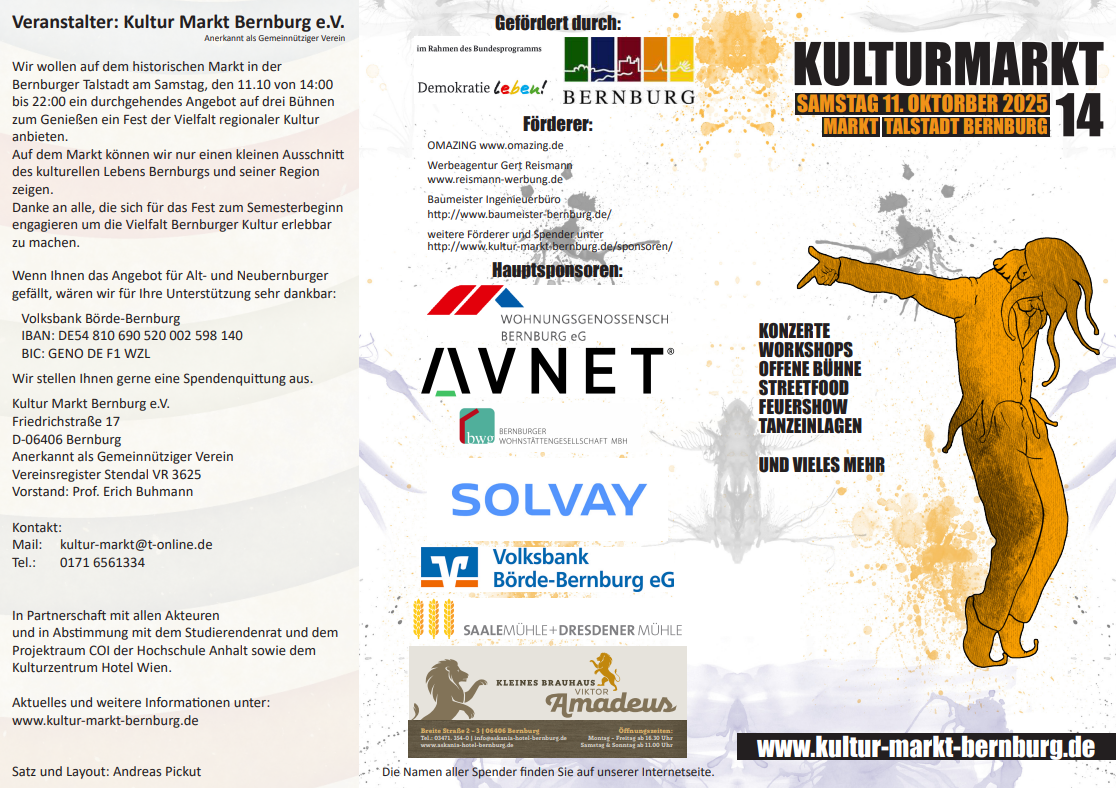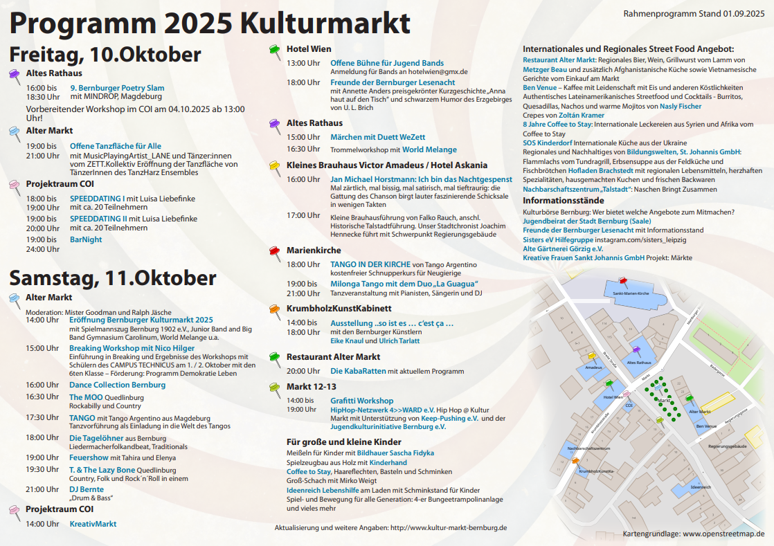 Das war der Kulturmarkt 2025 Das war der Kulturmarkt 2025 in Bernburg. Bilder Videos i Programm Bilder DANKE an die BILDAUTOREN: J. Colgan, A. Grefe, K. Conrad, D. Reinert, W. Löhr, M. Buchta, N. Hajjar, E. Buhmann und K. Oidtmann, Videos Feuershow (Videos von D. Reinert) Die Tagelöhner (Videos von D. Reinert) Impressionen des Kultur Marktes 2025 (Videos von A. Grefe, K. Conrad) Programm
